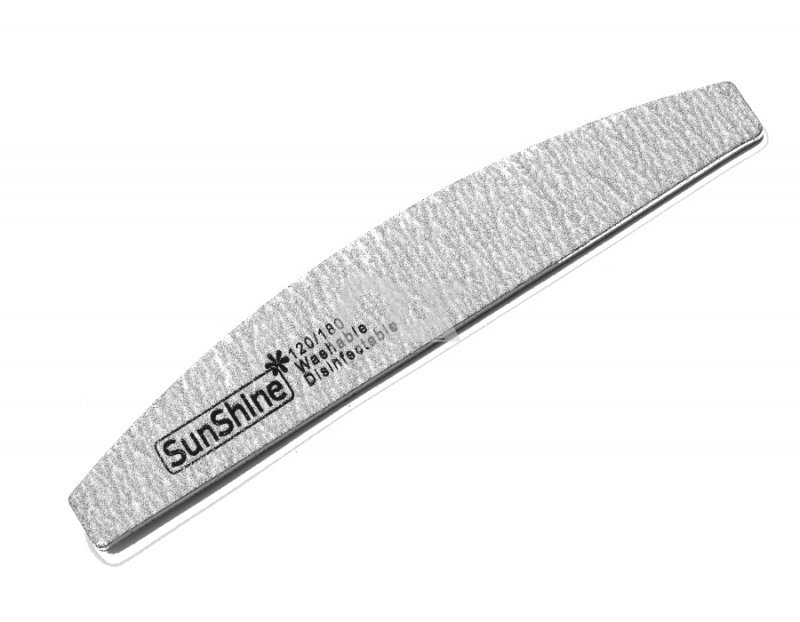 - Пилка для нігтів SUNshine сіра арочної форми – бік 120 досить жорсткий, підійде для спилювання гель-лаку або штучних нігтів. Бік з абразивністю 180 може використовуватися як для натуральних, так і для штучних акрилових і гелевих нігтів.