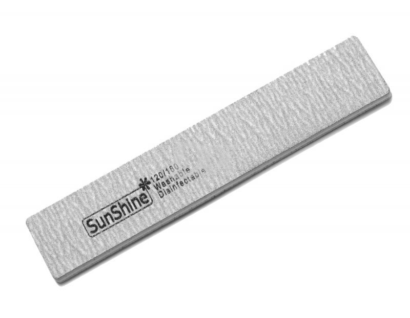 - Пилка для нігтів закруглена пряма SUNshine сіра – бік 120 досить жорсткий, підійде для спилювання гель-лаку або штучних нігтів. Бік з абразивністю 180 може використовуватися як для натуральних, так і для штучних акрилових і гелевих нігтів.