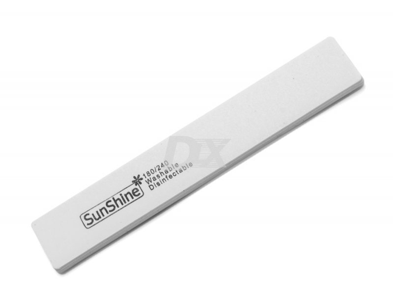 - Пилка для нігтів SUNshine біла прямої форми – бік з абразивністю 180 може використовуватися як для натуральних, так і для штучних акрилових і гелевих нігтів, бік з абразивністю 240 використовується для полірування натуральних нігтів.
