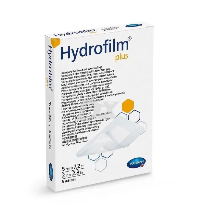 Hydrofilm Plus - прозора самофіксуюча пов'язка, виготовлена із напівпроникної поліуретанової плівки, має атравматичну подушечку для абсорбції секрету рани