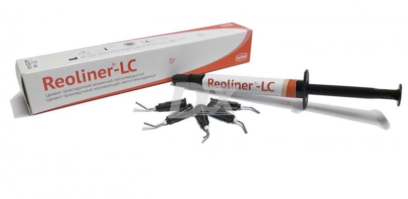 • Reoliner-LC відноситься до групи текучих світлотверднучих композиційних матеріалів. Випускається натурального світло-коричневого кольору без ідентифікації за шкалою Vita. Матеріал має високу індиферентність до пульпи зуба, задовільною адгезією до дентину і пружністю. Пломбування порожнини можна продовжувати через 2-3 хвилини після полімеризації прокладки.