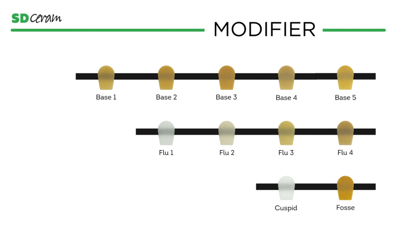 - SD Ceram MC Modifier (Модифікатор) – це спеціальний матеріал у лінійці керамічних матеріалів SD Ceram MC, який використовується стоматологами-техніками для тонкого налаштування кольору, прозорості та природності керамічних реставрацій, таких як коронки та вініри, дозволяючи досягти кращої естетики інтеграції та інтеграції з натуральними зубами, представлений у різних відтінках, включаючи базові та для певної анатомії (наприклад, Cuspid).