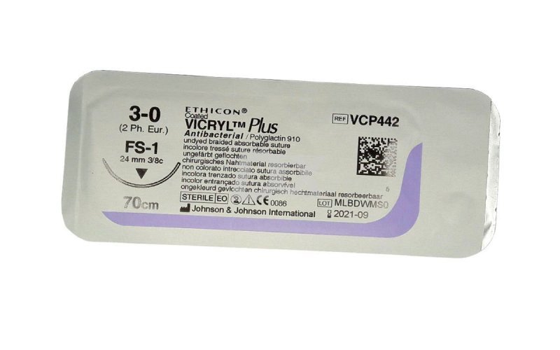 VICRYL PLUS — синтетична хірургічна плетена нитка з середнім терміном розсмоктування, оброблена антисептиком (плетений, не забарвлений) 70 см, 3/0.