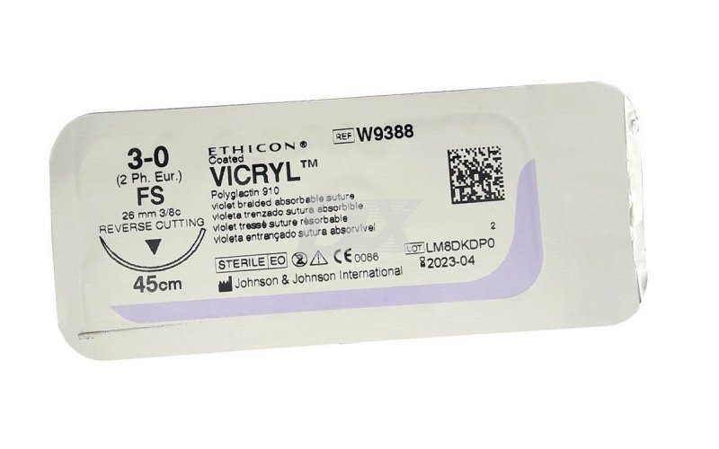 ОПИС VICRYL PLUS — синтетична хірургічна плетена нитка з середнім терміном розсмоктування, оброблена антисептиком (поліфілам, фіолет) 45 см, 3/0.