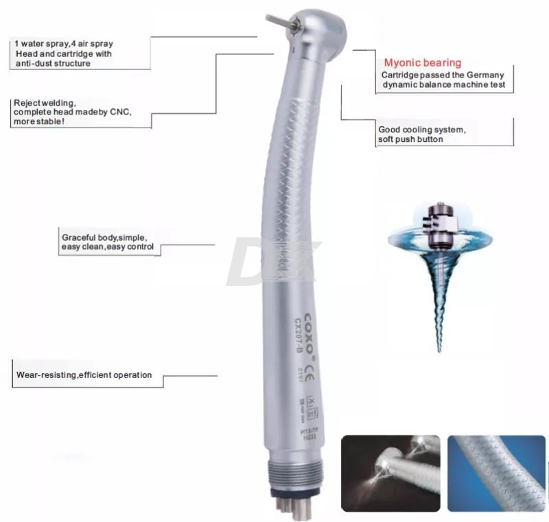 Стоматологічний турбінний наконечник CX207-B з німецькими підшипниками від Myonic, одиночним розпилювачем води і чотирма розпилювачем повітря, виробництва COXO.