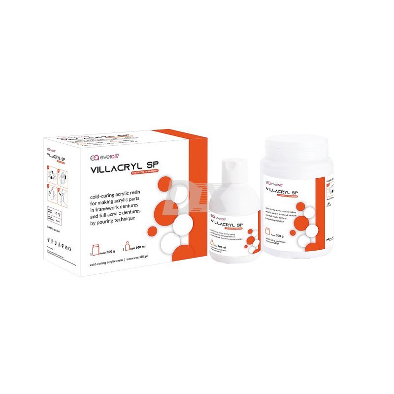 - Villacryl SP – це полімерний стоматологічний матеріал холодної полімеризації для виготовлення акрилових деталей у бюгельних, повних та часткових протезах методом лиття з використанням гідроколоїдних мас, силіконів для попереднього пломбування та силіконів для дублювання. Також підходить і для ремонту непрямого перебазування.