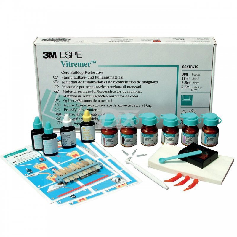 - Вітремер (Vitremer) естетичний склоіономерний пломбувальний матеріал нового покоління з потрійною полімеризацією. Препарат є двокомпонентним композитом, що складається з порошку та рідини. Порошок представлений фторалюмосилікатним склом, що не пропускає рентгенівські промені. Рідкий компонент є світлочутливим водним розчином модифікованої полиалкиноидной кислоти. VITREMER має всі основні властивості, властиві склоіономерам - зв'язуванням зі структурою зуба, фторовиділенням, біосумісністю, високою компресійною міцністю і зносостійкістю. Це єдиний у світі склоіономерний матеріал, що має потрійний механізм полімеризації, в процесі якої одночасно протікає 3 реакції затвердіння: класична склоіономерна, світлова полімеризація та хімічне затвердіння. Потрійний механізм полімеризації гарантує повноцінне та рівномірне затвердіння всього обсягу матеріалу незалежно від товщини шару та якості полімеризації.